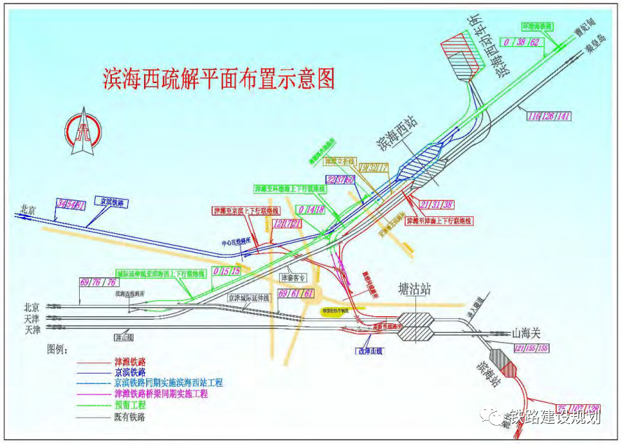 津潍至环渤海路联络线自黑猪河线路所引出,外包京滨引入城际车场;津秦场与城际场间预留联络线1条,为津潍铁路在滨海西开行立折车提供条件。