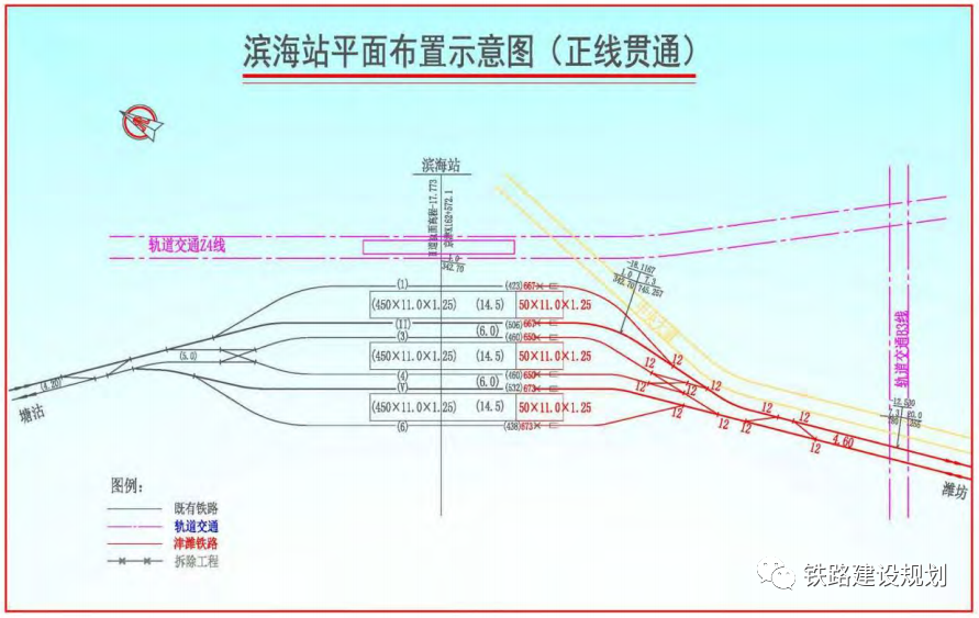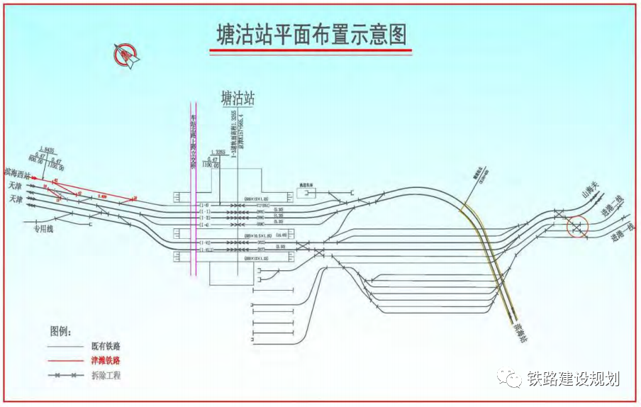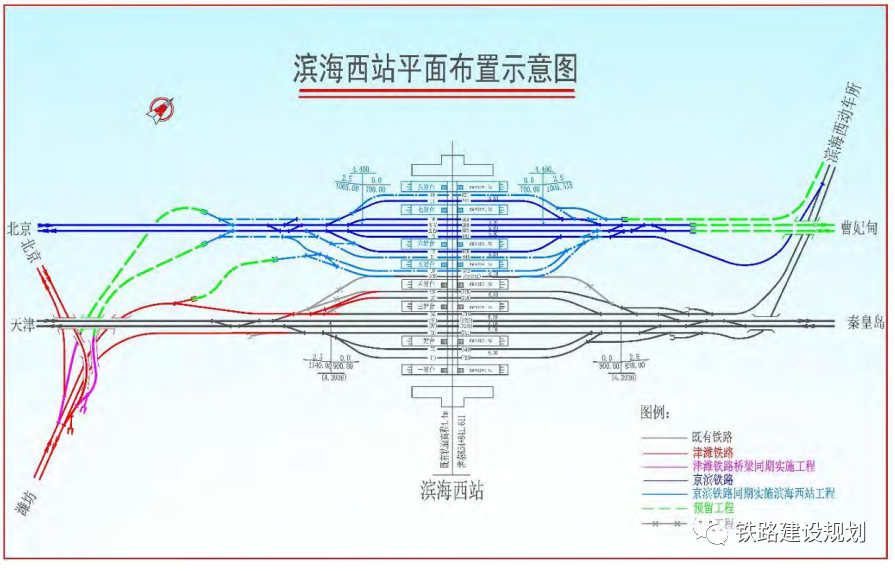 本站规划总规模8台18线(含4条正线),车场由东向西依次为津秦车场(既有4台9线)、城际车场(规划4台9线)。津潍正线贯通引入津秦车场,对咽喉相应改建;