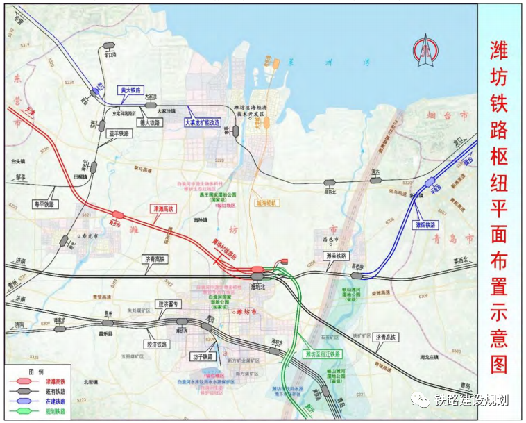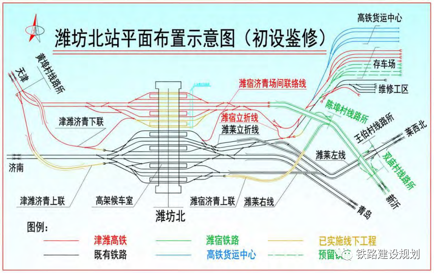 潍坊北站济青、潍莱车场已于2018年12月开通运营,车站站房为南北高架站房,并设置城市通廊。车站规划设有联络线满足东营至青岛、烟台方向,临沂至济南方向,临沂至烟台、青岛方向跨线车的交流。