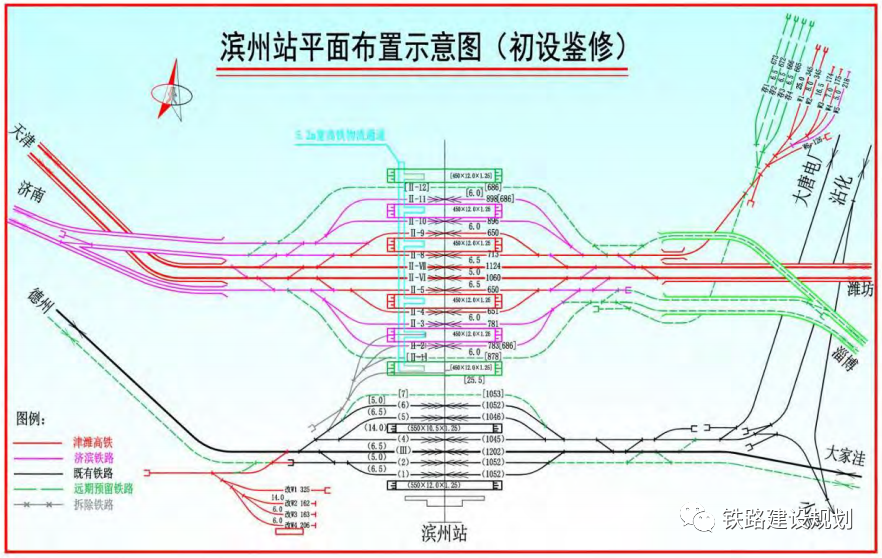其中本线中穿高速车场布置,设2台6线(含正线);车场两侧分别布设济滨和规划滨州至淄博城际的上下行车场,济滨上下行车场各按1台2线同步实施;规划滨临城际上下行车场各预留1台1线规模。高速车场到发线有效长度均满足650m。