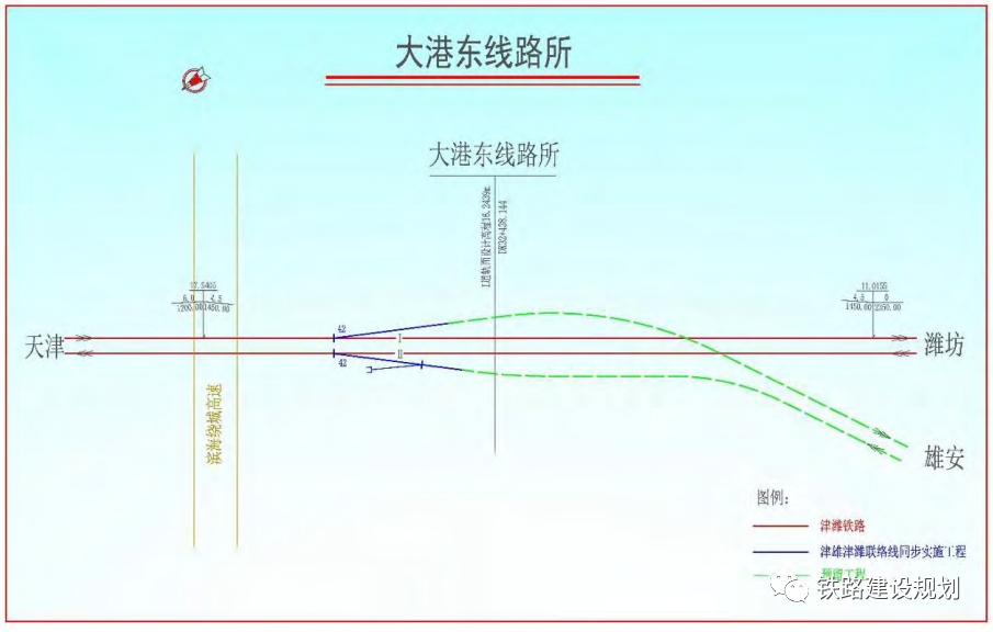 津潍津雄上下行联络线自津潍正线以道岔侧向引出,新建大港东线路所,线路所中心里程DK32+438.254,下行联络线同期实施长度0.57km,上行联络线同期实施长度0.633m,同期实施安全线1条。同期实施工程投资单独计列。