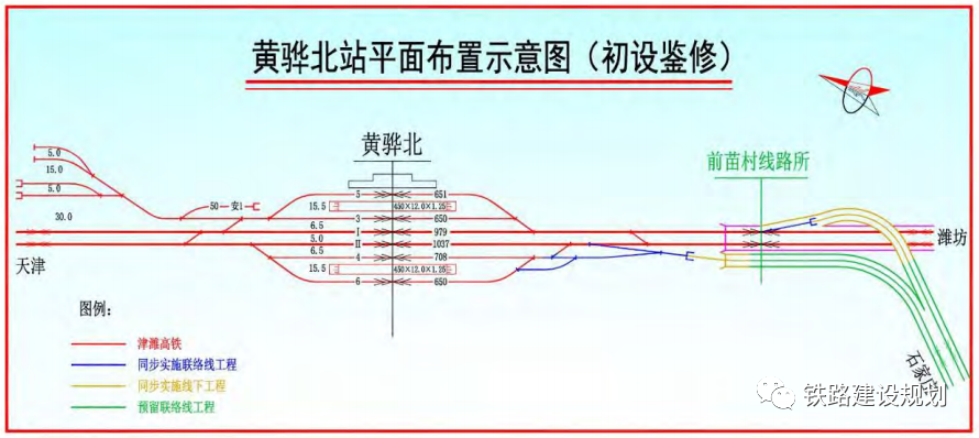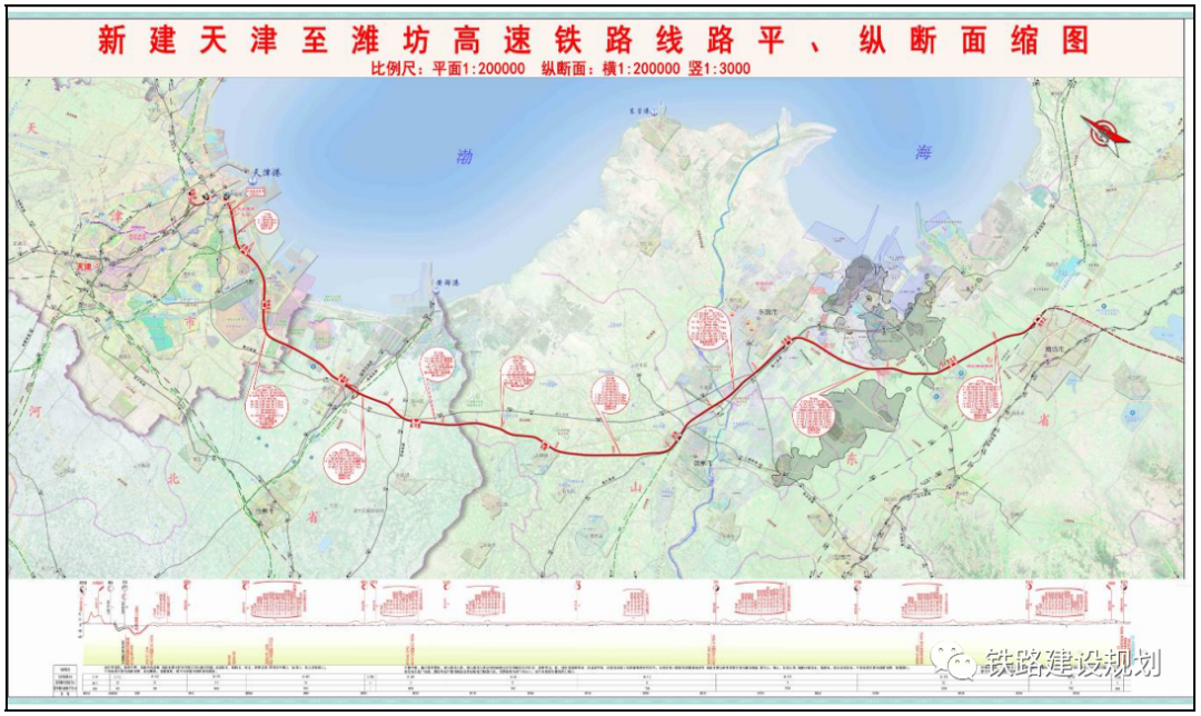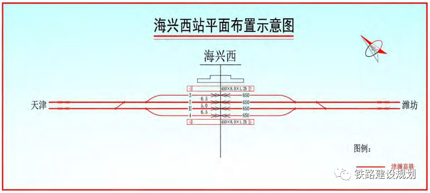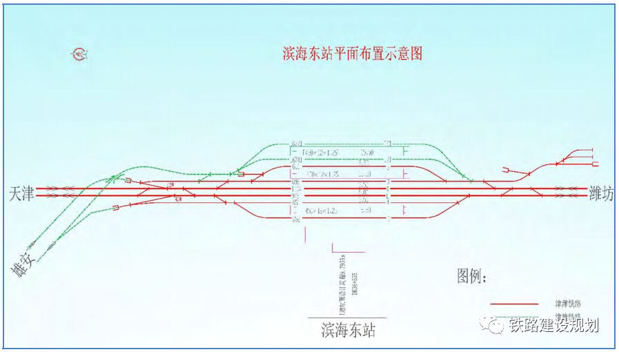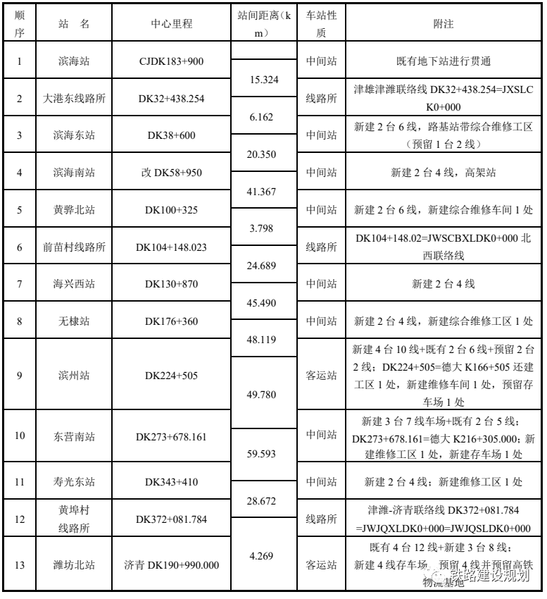 引入既有站车站6个,分别为滨海西站、塘沽站、滨海站、滨州站、东营南站、潍坊北站。其余均为新建中间站。