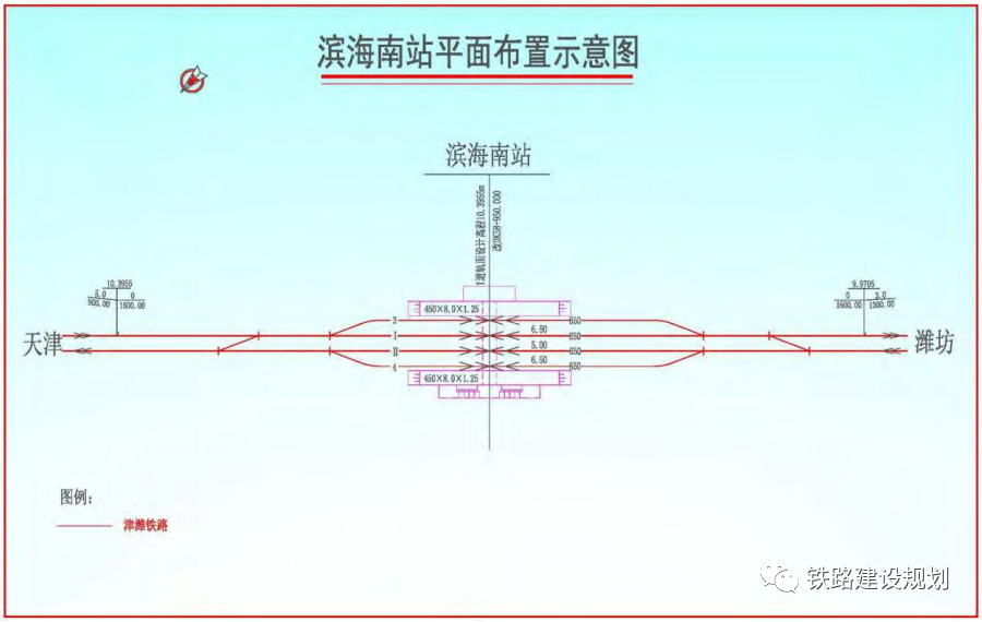 滨海南站为津潍铁路新建中间站。车站中心里程为改DK58+950。站房位于线路大里程方向左侧。