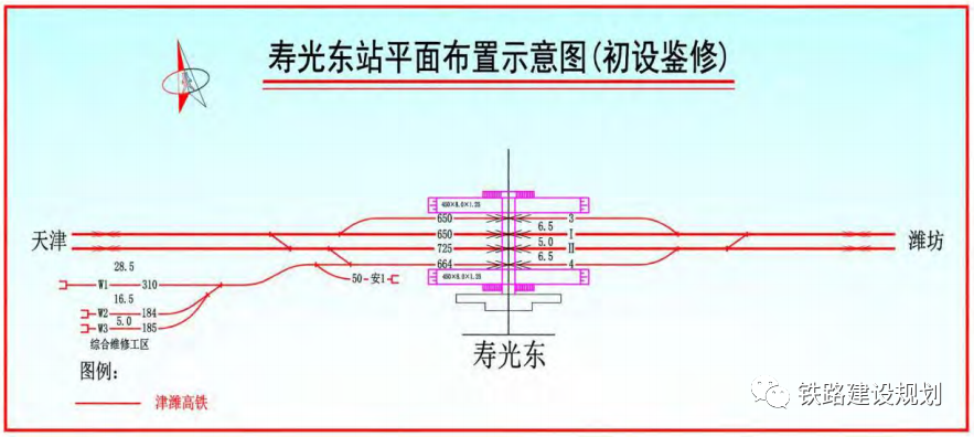 寿光东站按2台4线(含正线)设计,到发线有效长度均满足650m,设侧式站台和基本站台各1座,设10m宽旅客地道1座。车站设维修工区1处,设轨道车停留线、接触网作业车停放线各1条,大机停放线1条。