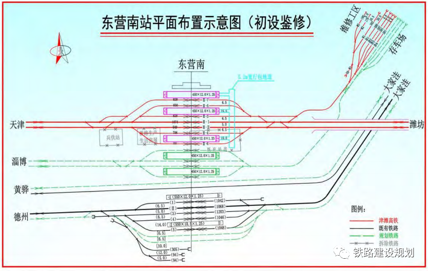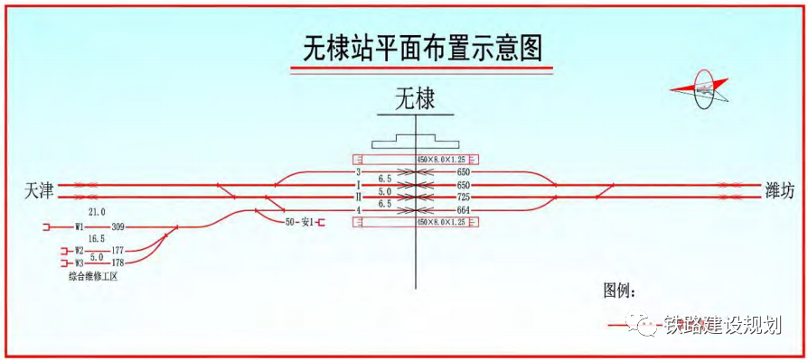 无棣站按2台4线(含正线)设计,到发线有效长度均满足650m,设侧式站台和基本站台各1座,设10m宽旅客地道1座。车站站对右维修工区1处,设轨道车停留线、接触网作业车停放线各1条,大机停放线1条。