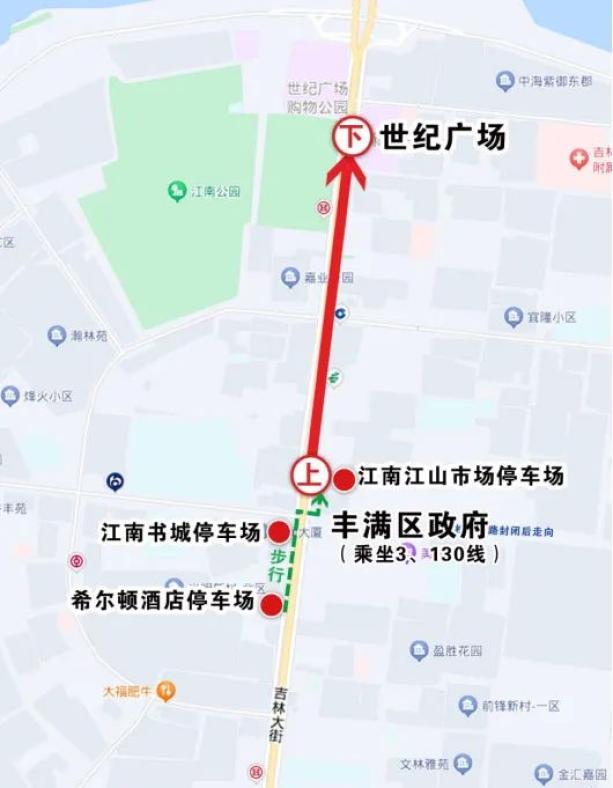 (4)江南江山市场停车场、江南书城停车场、希尔顿酒店停车场,在丰满区政府站乘坐3线、130线公交车,世纪广场站下车。