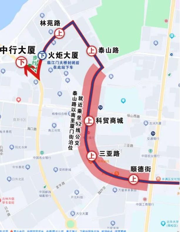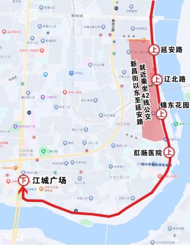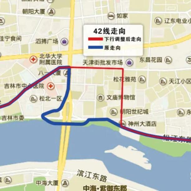 42线临时绕行,上行走向不变;下行由北京路绕行青年路、天津街、松江东路恢复原走向。