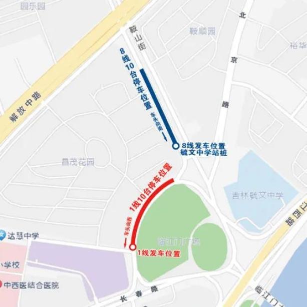 (1)长春路建行停车场,在中西医结合医院站乘坐8线公交车,临江广场站下车。