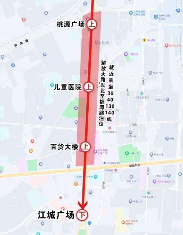 (3)朝阳大厦停车场、物华商场停车场、吉林剧场地下停车场、财富广场地下停车场、滔博广场停车场,在百货大楼站乘坐30线、40线、130线、140线公交车,江城广场站下车。