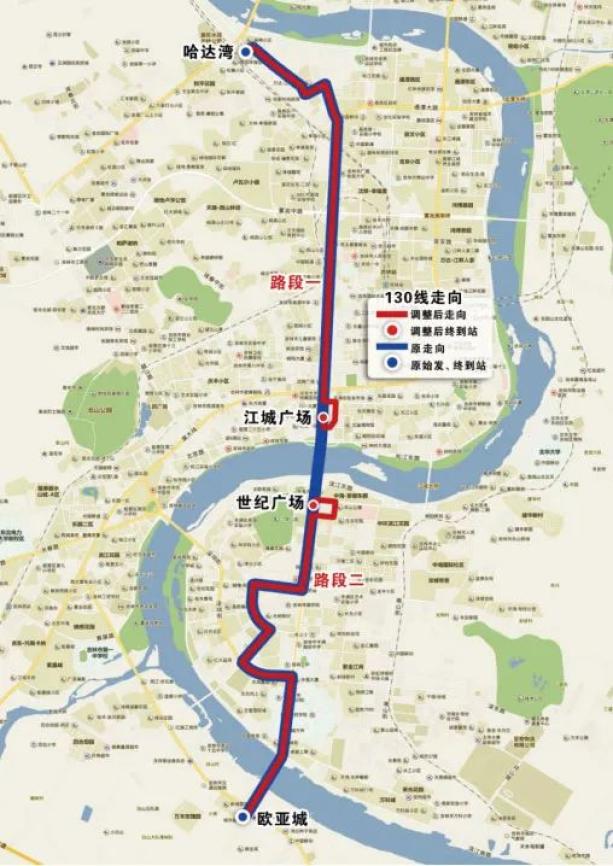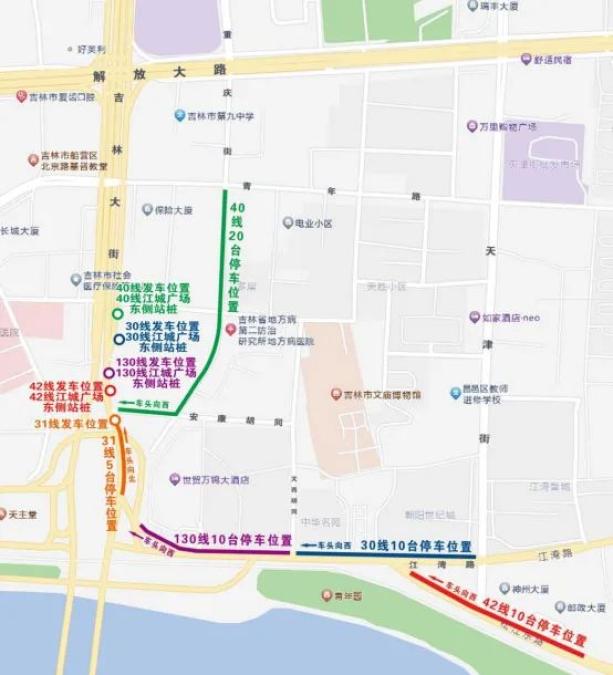 130线实施断发。路段一:哈达湾至江城广场,由吉林大街、青年路、重庆街、安康胡同、吉林大街回转;路段二:欧亚综合体至世纪广场,由吉林大街、玉山路、长江街、华山路、吉林大街回转。