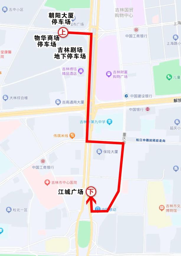 (4)朝阳大厦停车场、物华商场停车场、吉林剧场地下停车场摆渡线:由朝阳大厦停车场始发,途经光华路、吉林大街、青年路、重庆街、安康胡同,终到江城广场。