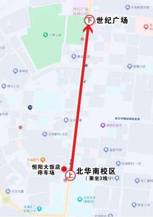 (5)恒阳大饭店停车场,在北华南校区站乘坐3线公交车,世纪广场站下车。