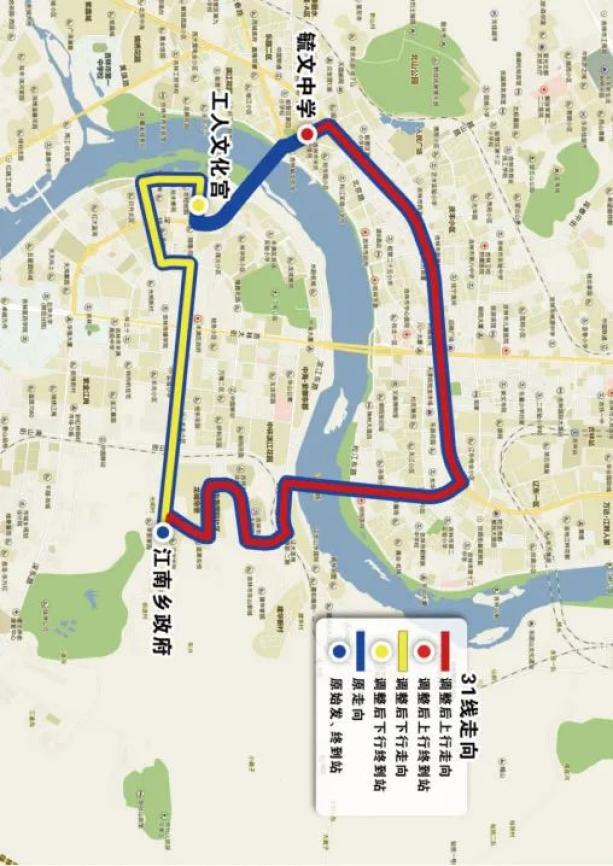 31环线实施断发,并改为上下行走向。内环:由江南乡政府始发,终到毓文中学,在临江门广场回转。外环:由江南乡政府始发,终到工人文化宫。
