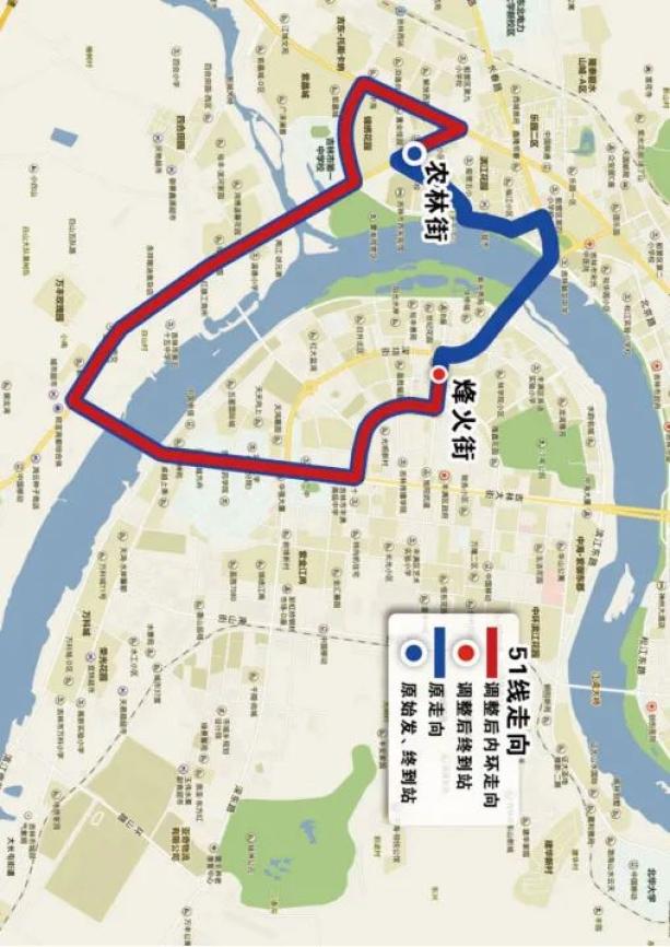51线改为上下行走向。内环:由农林街始发,终到烽火街,由深圳街、三亚路回转。外环临时停运。