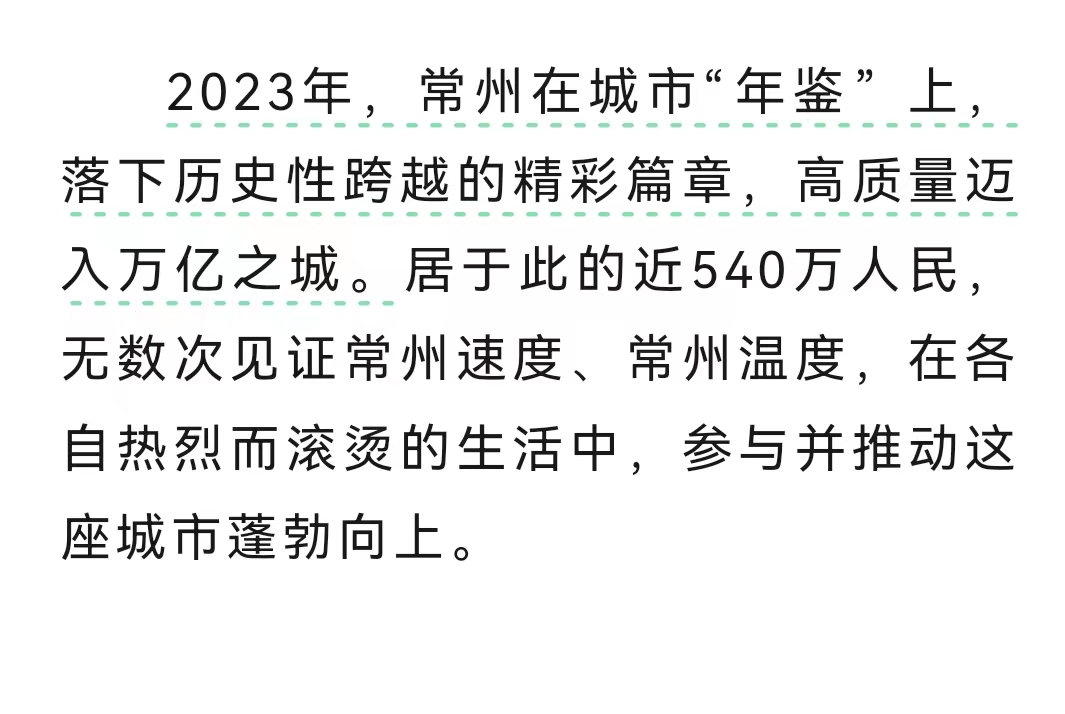 “常州发布”微信公众号称,2023年,常州在城市“年鉴”上,落下历史性跨越的精彩篇章,高质量迈入万亿之城。