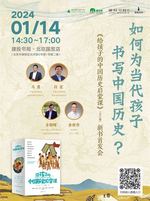 或许,历史对很多人来说都枯燥无味,尤其对接触历史不多的孩子,所以历史启蒙更得谨慎用心,避免孩子一开始就落入无趣的故纸堆。如何为当代孩子讲述好中国历史,如何把历史说有趣,是现代教育学者所面临的一个大问题。《给孩子的中国历史启蒙课》以历史学家的专业视角,有趣的语言文字来为孩子呈现中国历史。1月14日下午,广西师范大学出版社魔法象童书馆邀约了本书主编马勇老师,本书审订者许宏、方朝晖老师和文化学者余世存做客建投书局·北京国贸店,和大家聊一聊如何为当代孩子书写中国历史。