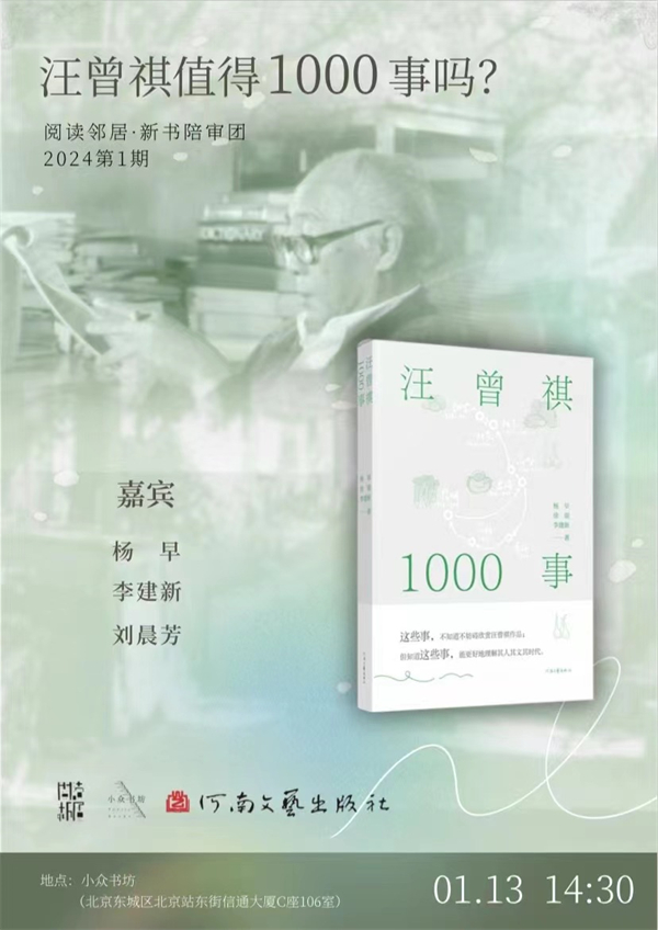汪曾祺的创作贯穿中国现代与当代文学,是“最后一个京派作家”。新书《汪曾祺1000事》包含1000多个“世说新语”式的小故事,以时间为主要线索,连缀成一部简明而完整的汪曾祺传记。“这些事,不知道不妨碍欣赏汪曾祺作品;但知道这些事,能更好地理解其人其文其时代。”周六下午,我们邀请两位汪曾祺研究专家杨早、李建新,与《汪曾祺1000事》出版方河南文艺出版社的副总编辑刘晨芳一起做客小众书坊,与读者分享这本新书。