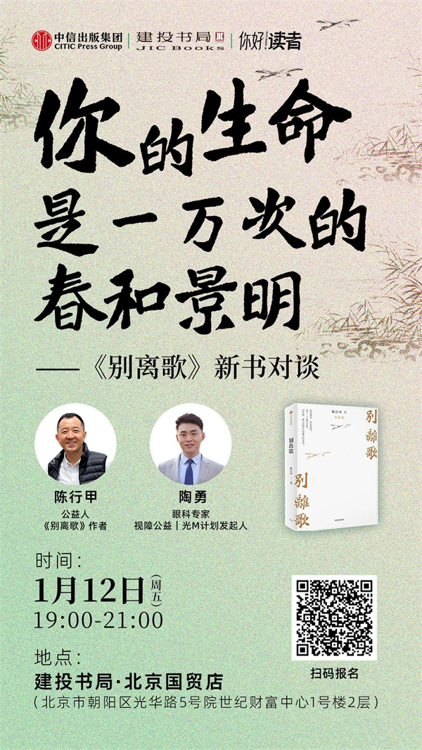 新年伊始之际,中信出版集团邀请公益人陈行甲、眼科医生陶勇,于1月12日晚做客建投书局·北京国贸店,从陈行甲新作《别离歌》出发,共同聊聊自我和人生,也寻找那些指引我们前行的力量。