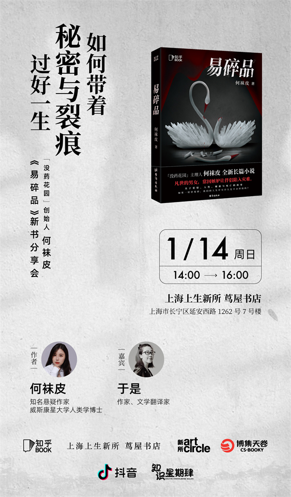 本周日,《易碎品》作者、自媒体账号“没药花园”主理人何袜皮将与作家于是一起,围绕悬疑类文学作品的写作与阅读和读者畅谈。在互联网高度发达的当下,每个人的秘密很难掩盖,如何带着秘密与裂痕过好一生,或许两位嘉宾能给到答案。