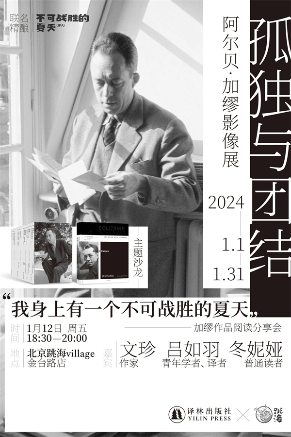加缪曾写道:“在隆冬,我终于知道,我身上有一个不可战胜的夏天。”译林出版社联合北京跳海village,在1月1日至1月31日举办“孤独与团结——阿尔贝·加缪影像展”。影展期间,1月12日晚,还将开展“我身上有一个不可战胜的夏天”加缪作品阅读分享会。