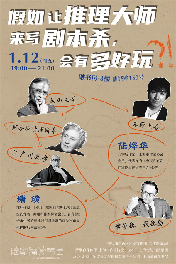 1月12日晚,我们邀请到80后作家陆烨华与推理作家、曾为《明星大侦探第五季》提供诡计的塘璜,一起组个推理杀实验局,假设一些很TOP的推理小说家来写剧本杀,谁的作品更合适改编、谁的作品会更好等问题,在这些假设中一起认识顶级推理作家们的流派与风格。