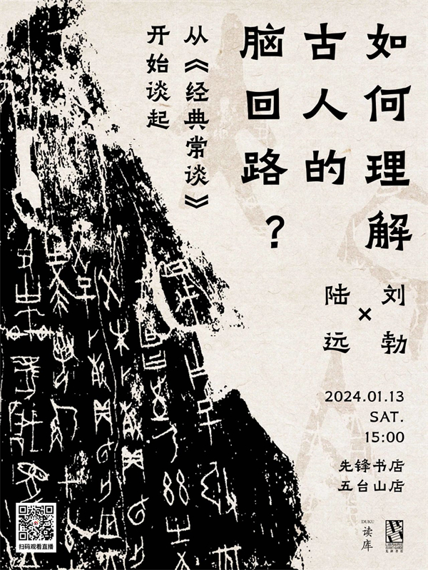 朱自清先生曾在《经典常谈》中说:“经典训练的价值不在实用,而在文化。”经典是对共同记忆的建构过程及其结果的呈现,也以一种潜移默化的方式对人们的思维和行为方式产生影响。对经典的阐述一直在变化,但某些文化的基因,却始终根植在人们不经意的言谈举止间,构成了一种微妙的传统文化的延续。1月13日,我们邀请到作家刘勃做客南京先锋书店,与社会学学者陆远展开对谈,以趣味性的方式破解历史情境,聊聊古代的典籍系统和知识结构,引领大家了解各类古书的来历、概要、发展历程,感受传统文化更深层的内涵。