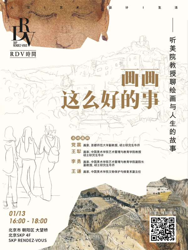 你喜欢画画吗?曾几何时,你是不是也有过动手画画的冲动?画画可以给我们的生活带来什么?作为艺术的绘画,真的可以启发心智、滋养人生吗?学习绘画,必须经过专业训练?如何看待各类美术培训班?一个对画画感兴趣的人,日常生活中可以如何实践……1月13日下午,艺术家党震、王犁、李勇、王谦将携新书《速写的边缘》《回到铅笔》《幸福地画一会儿》《像与不像》做客SKP,分享他们的艺术思考和人生故事,畅谈他们对当下艺术教育和美育实践的理解和看法。