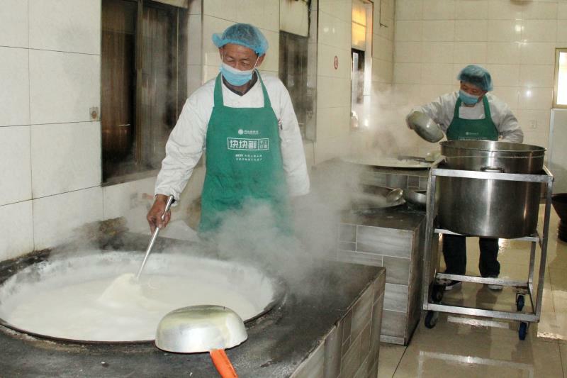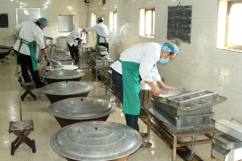 做一款上等优质的古月豆腐,需要十道工序。选材使用黑龙江的非转基因优质大豆,泡豆、洗豆、磨豆,煮浆、过滤、点卤、静置成形、装袋、压制成形、冷却等环节。
