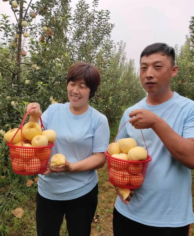 现代农业机械化,引进世界优良品种:黄金密富士苹果,三个品种嫁接一棵种苗,两次嫁接(根:新疆野苹果;中间砧木:美国M26;品种:富士黄金蜜)。