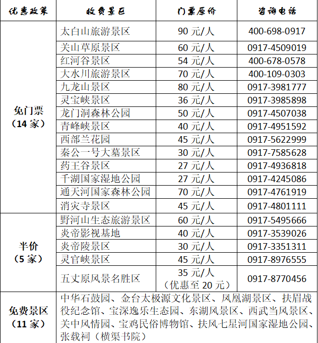 为贯彻应国家、省、市“5.19中国旅游日”惠民活动,宝鸡市19家A级以上收费旅游景区积极响应,在当天推出免费或半价政策,其中免门票14家,半价5家(具体见5.19中国旅游日当天宝鸡市景区门票优惠政策表)。