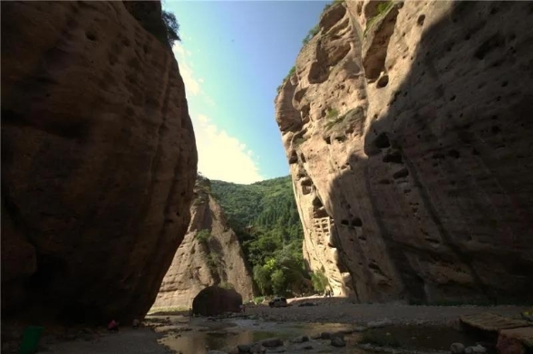 灵宝峡景区位于宝鸡市陈仓区香泉镇石尧村,地理上属于宝鸡北部的陇山山脉,环境幽雅地势险要。峡谷的形成,是由于沙砾岩层在河水长期的侵蚀切割下,形成陡峭峰壁,峡谷两边崖壁上,布满蜂窝状大大小小的风雨侵蚀孔洞。