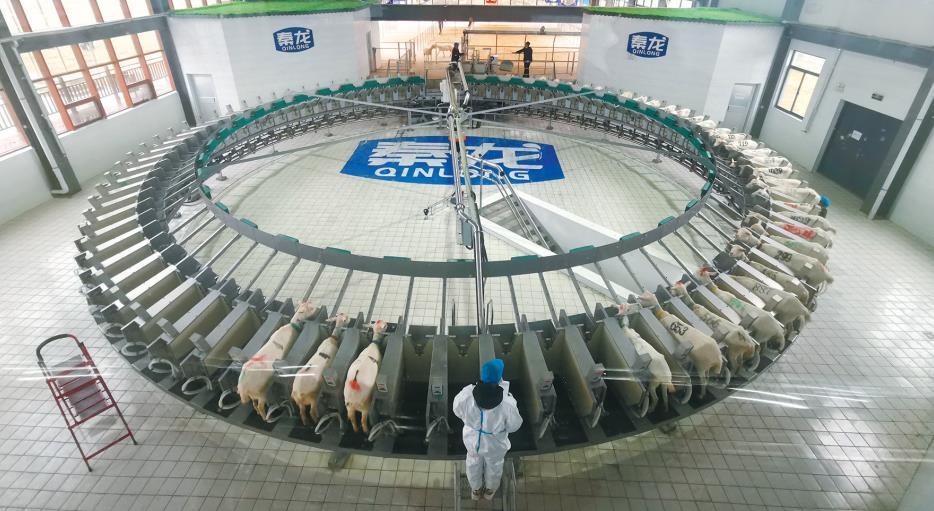 当日9时,到了给奶山羊挤奶时间,羊群通过单向赶羊通道有序进入百位转盘式智能挤奶设备完成每日的产奶任务。“我们使用的百位转盘式智能挤奶设备,实现了每100只羊从清洗到完成挤奶仅需10分钟,挤奶效率大幅提升。”于沁园说。
