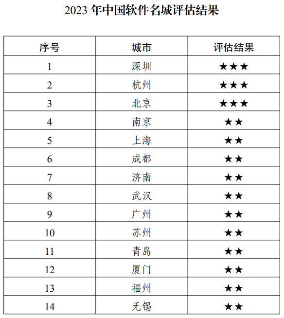 近日,工信部发布《关于2023年中国软件名城评估结果的通告》,公布2023年中国软件名城评估结果。在全国14个中国软件名城中,深圳、杭州及北京位居前列。