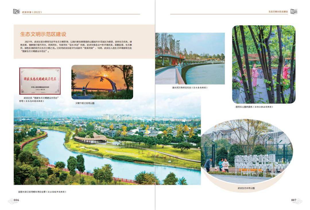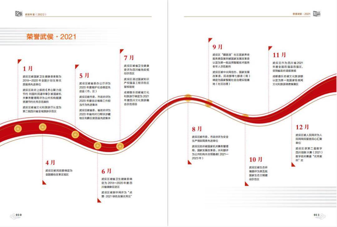 二是卷首彩页突出展示年度重点工作。以“庆祝中国共产党成立100周年”等年度重点工作为主题,精选图片作卷首彩页;用图说形式展现2021年武侯区取得的成就和获得的荣誉,直观呈现经济社会发展主要指标。