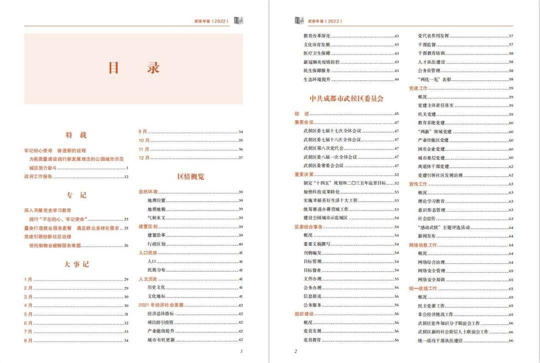 一是“专记”系统记述年度特色工作。“专记”收录“党史学习教育”“就业服务推进”等专题文章,突出反映武侯区2021年特色工作。