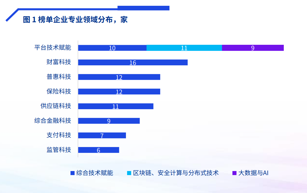 本期评选中,共有100余家来自综合金融科技、财富科技、保险科技、普惠科技、供应链科技、支付科技、监管科技以及平台技术赋能等八个专业领域的金融科技企业上榜。从专业领域分布看,平台技术赋能类企业占比29%、财富科技类企业占比15.5%,分列第一、第二位;普惠科技和保险科技并列第三,占比11.7%;大数据、AI和区块链仍是金融科技底层技术中的主流应用核心技术。