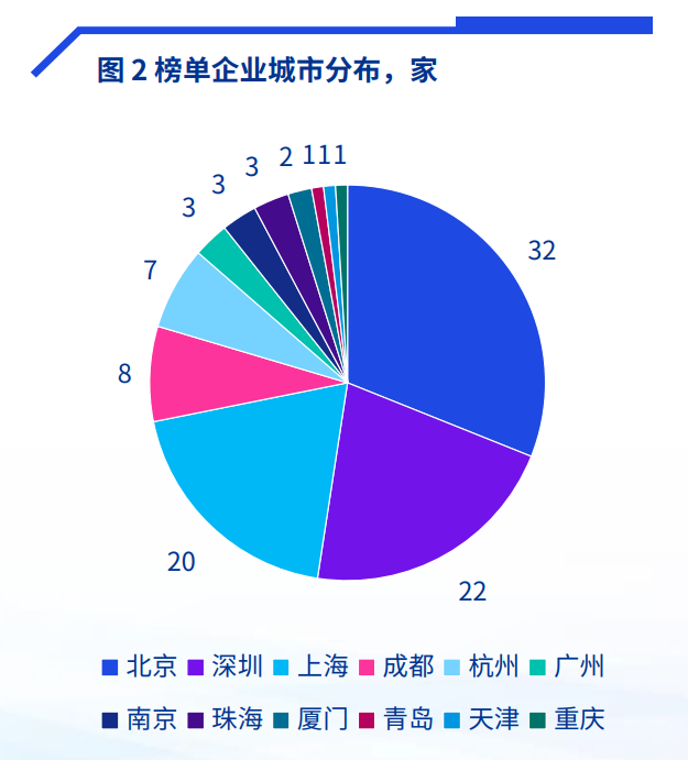 从城市分布看,2023年,北京、深圳、上海三地的上榜企业数量明显领先,分别为32家、22家、20家。而成都地区入榜企业数量从去年的7家上升到8家,首次排名全国第四,位居中西部第一。
