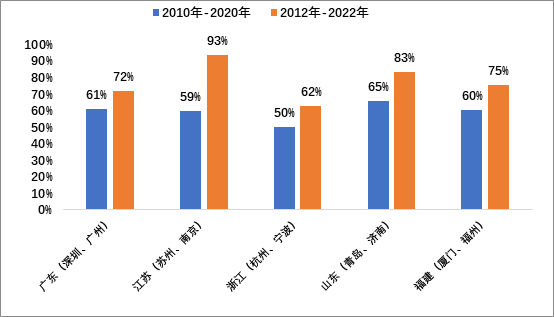 值得注意的是,过去五年北京和上海的人口变化并不大,而且北京人口还是净流出。这是否与2020-2022这三年的疫情有关?毕竟超大城市的人口密度大,病毒传播快,对人口流入带来不利影响。那么,这是否会使得我国的大城市化进程出现逆转呢?如果把时间拉长一点,观察期延长至2012-2022年,就不难发现大城市化进程还在持续。