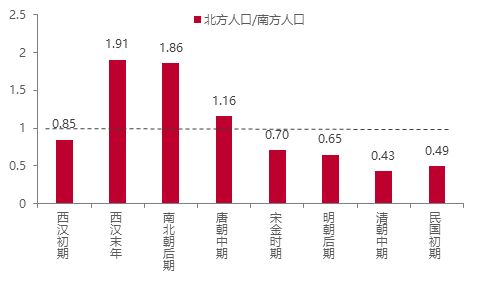来源:《中国分省区历史人口考》,中泰证券研究所。注:省份样本为传统上“汉地十八省”所包含的省份,南北以“秦岭—淮河”一线划分