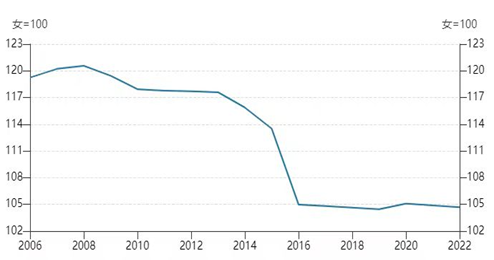 结婚率的下降,一方面可能是经济方面原因,如年轻人失业率偏高、抚养负担重等因素,另一方面,或与男女比例失调有关。如在2006-2010年出生的人口中,男性比女性多出约20%,之后出口的性别差有所缩小,但仍维持在115:100以上,直到2016年以后才回落至105:100。