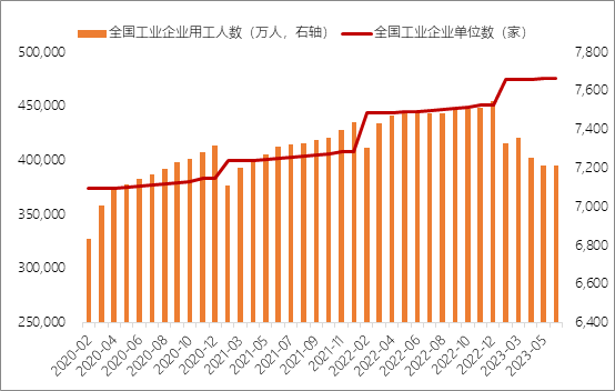 2022年下半年以来,我国出口增速大幅下降,与此相对应的是,传统工业企业的就业人数下降,尽管规模以上工业企业的数量还在增加。如电动载人汽车、太阳能电池、锂电池等出口显著增加,但这类企业都属于资本密集型的,对就业的带动有限。