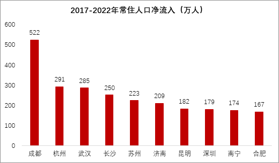 从过去5年看,我国人口净流入最多的10个城市,多数都为省会城市,其中成都排名第一,达到522万人。是什么原因使得成都成为过去5年人口流入最多的城市呢?主要因素应该是农民工的回流。因为从过去五年看,重庆和四川这两个西部省市都是人口净流入规模居前的区域。