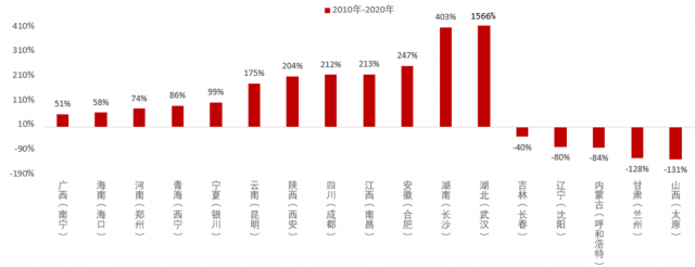 从2010-2020年看,即便是经济相对欠发达的省份,其省会城市的人口也都无一例外净流入。如有些处在东北、西部和中部的省份,过去10年间人口净流出,但其省会城市人口仍为净流入。