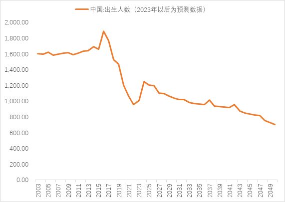 从今年上半年的出生婴儿的数据看,不少权威机构判断今年全年新生人口或低于900万。我们按照前两年的出生率水平推算,2023年新出生人口基本与2022年持平,2024年回升到1200万以上,之后便持续缓慢回落。