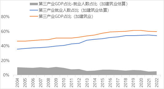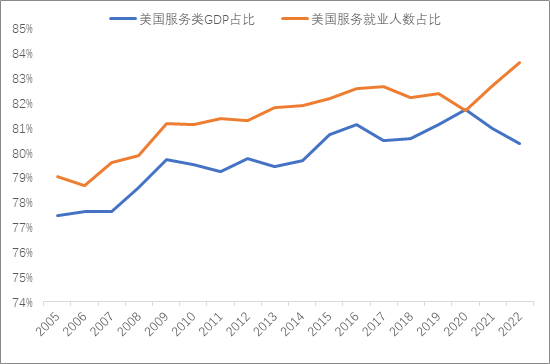 若参照美国的数据,美国服务业就业人数占比长期以来都要高于服务业的GDP占比,2022年美国服务类GDP占比为80%,服务业就业人数占比高达84%。