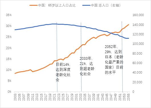 目前我国已达到世界银行的深度老龄化社会的标准,预计2033年将达到超老龄化社会的标准,到2052年将达到日本目前的老龄化水平(日本是目前老龄化最严重的国家)。