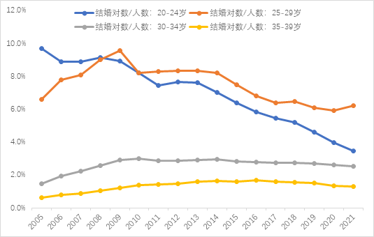 从民政局的结婚登记数据来看,2020-2022年间,各年龄段登记结婚对数与人口数的比例没有出现明显的异常变化,与之前的趋势基本一致。