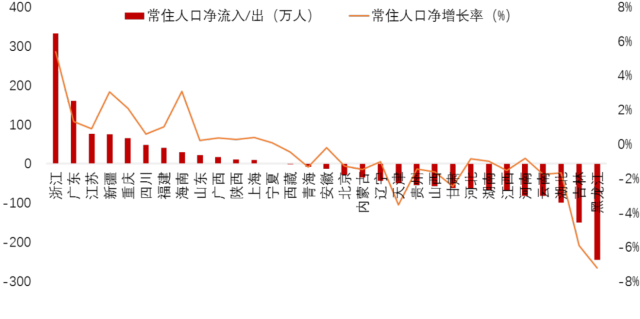 我们对过去五年各省市的人口流向进行分析,剔除自然增长率后,发现常住人口呈现从北向南流动的整体特征。北方城市大部分呈现明显的人口净流出状态,尤其东北地区人口流出比率较大。长三角、珠三角、川渝经济圈净流入人口数量居前。