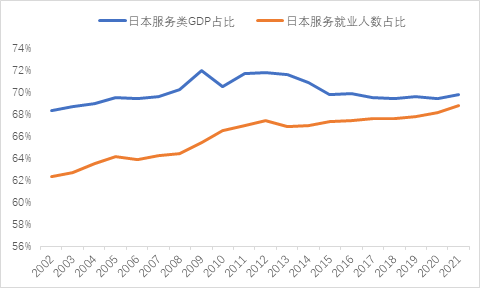 而作为步入超老龄化国家的日本,尽管其作为制造业强国,富有工匠精神,但服务业就业人口占总就业人口的比重也达到69%。德国则为65%。这两个国家的服务业增加值占GDP的比重分别为70%和69%,均远超中国。