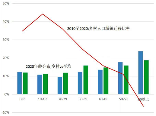 下图中,红线代表从2010-2020年中国农村不同年龄段的人口转移到城镇的比例,其中50-59岁年龄段的比例为10%左右,超过60岁后则从城镇净流入到农村。蓝柱代表农村该年龄段的人口占比,绿柱代表全国该年龄段人口的占比。不难看出,超过50岁的农村人口数量大幅高于城镇人口数量。